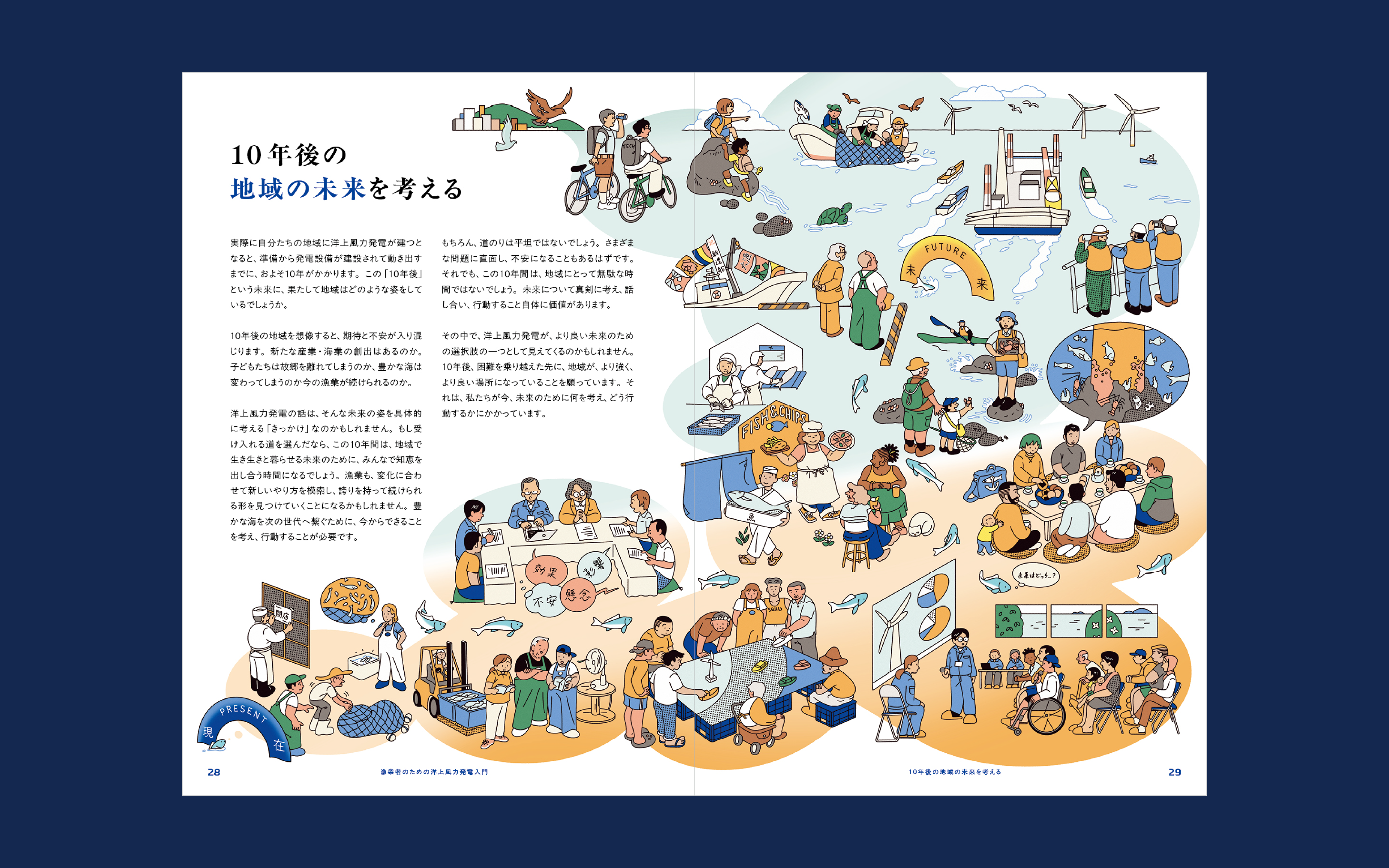 フィッシャーマンジャパンのみなさんや洋上風力事業を迎え入れた、もしくは検討中の地域の漁業者さんに話を伺いながら、時間をかけて内容をつくっていきました。その過程にデザイナーとして立ち会えたことも大切な経験となりました。