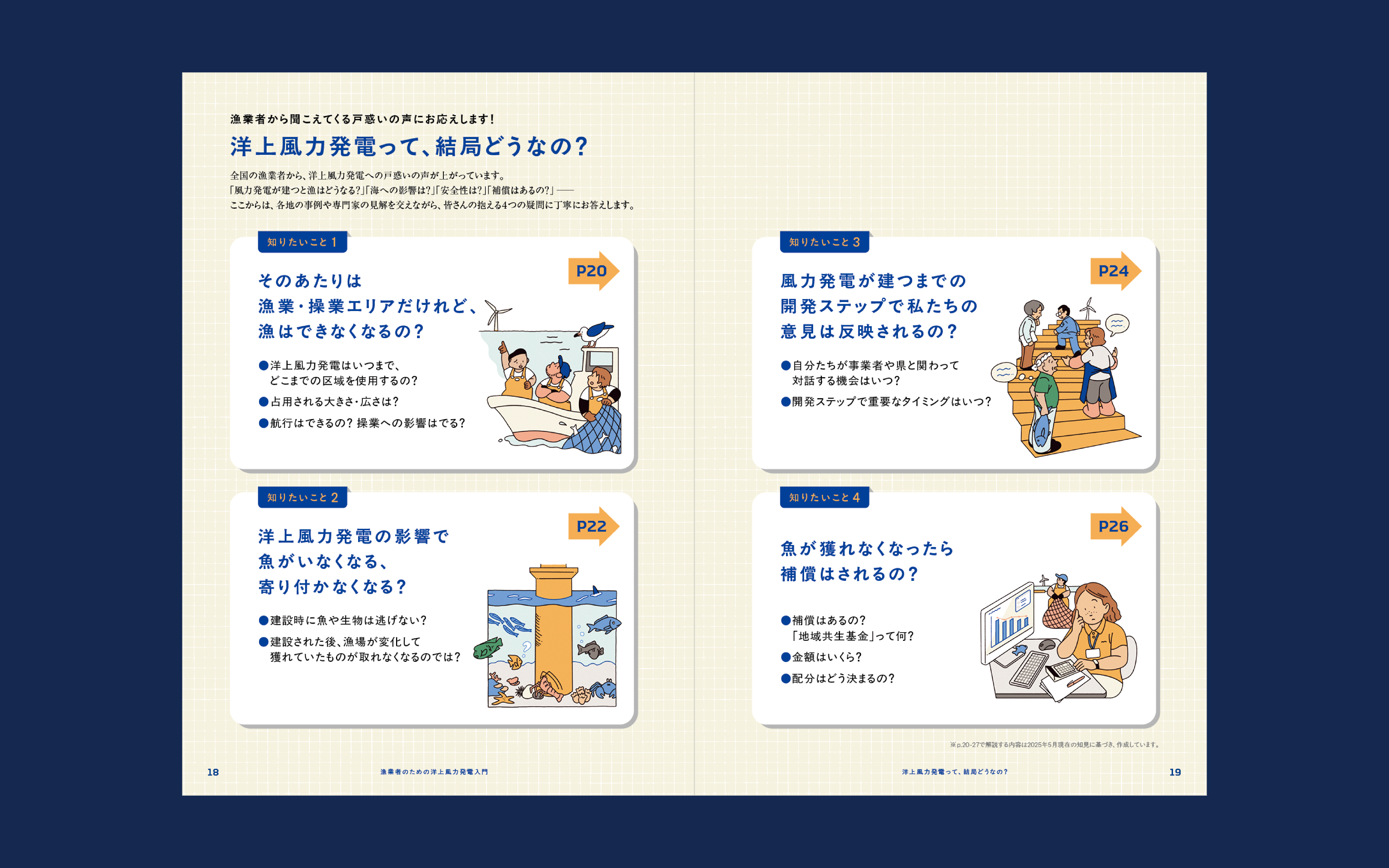 自然エネルギー財団が発行した 『漁業者のための洋上風力発電入門』 という冊子のデザインを担当しました。このプロジェクトは、海の先行事業者である漁業者の方々の意見を聞きながら、気候変動対策としての洋上風力発電をどのように進めることができるかを模索するコミュニケーションツールとして始まりました。